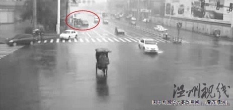监控录像显示:5月20日中午,天下着雨,温州市区信河街上的车辆并不多。12点06分,一辆黑色的奔驰轿车突然转向非机动车道,撞到一名骑自行车的男子。该男子腾空约2米高,先落在了旁边一辆三轮车的顶棚,继而弹到地上,一动不动。此时,黑色奔驰车非但没有停车,反而加速逃逸。